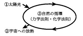 §2 物質循環と持続可能性について 2-1 活動を維持する条件 2-2 地球は熱エントロピー(熱汚染)を宇宙に捨てる星 2-3 大気汚染は環境破壊の一例 2-4 地球は物エントロピーを熱エントロピーに変換して,捨てる星 2-5 環境破壊とは自然の循環を破壊すること 2-1 活動を維持する条件 リサイクル運動や行政は,『ごみゼロ社会』を目指した。そもそも,これが物理学を無視していて,間違っている(9)。 熱物理学によれば,どのような活動でも必ずエントロピー(汚染)を発生する。このエントロピーをそのままにしておくと,エントロピーが溜まって活動を続けることができなくなる。活動を続けるには,廃物と廃熱を捨てるという方法で,このエントロピーを処分しなければならない。 したがって,人間社会が活動を続ける限り,『ごみゼロ社会』にすることは不可能である。不可能なことを目的にすれば,失敗するのは当然である。 第1図 活動を維持する条件 ![]() このことをもう少し詳しく説明すると,どのような活動でも,これを維持するには第1図に示すように3つの条件が必要である。それは,①入力,②出力,③作動物質の循環である。(10) ここで物質循環とは,物質の力学的運動や物理・化学的変化のつながりである。たとえば,ガソリンエンジンの場合,燃料と空気を取り入れて圧縮する。次に点火して燃焼させ,膨張させて仕事をさせる。そして,排気して,新しい空気と燃料を取り入れて,また同じことをする。 取り入れる空気と燃料はエントロピーの小さい入力であり,排気はエントロピーの大きい出力である。これにより,エンジンはエントロピー増大を免れることができて,活動を続けることができる。 また, この物質循環によリエンジンの状態を復元することは重要であって,エンジンは,この「復元によりまた同じことをする」という方法で活動を統けることができる。工学者はこれをエンジンのサイクリック運転と言っている。 このエンジンの物質循環は,力を加えれば物が動くなどの力学の法則と温度を上げれば反応するなどの化学の法則の組み合わせでなされている。 これまで,活動はエントロピーの法則によっておこなわれるかのような誤解があったが,エントロピーはその増大則が否定されないかぎり,その他のことは何も主張しない。実際の運動や変化は,エントロピー増大則で実行されるのではなく,力学法則と化学法則によってなされている。 活動が,この力学法則と化学法則による物質循環によって維持されることは,エンジンの研究から得られた結論である。もしもエンジンの活動を維持できなければ飛行機は墜落することになるので,この活動維持の条件を見いだすことはエンジン研究の最大の課題であった。 生命も活動を維持するエンジンである。動物の場合,①入力として空気,水,食料,②出力として,運動, 排気,廃熱,排尿,排泄,③物質循環として血液やリンパ液などの循環や細胞の中の各種の化学サイクルがある。このいずれが止まっても回復しなければ死ぬしかない。生命も,普通のエンジンと同じく力学法則と化学法則による物質循環で活動を維持しているのである。 TOP 2-2 地球は熱エントロピー(熱汚染)を宇宙に捨てる星 第2図 地球エンジンの条件 ![]() 地球環境も同じくエンジンである。地球上にいろいろな活動が数十億年も維持されたのは,第2図に示すように,地球の活動が①入力②出力③物質循環,というエンジンの3条件を満たしていたからである(10)。 ①入力としては,気温15度の地表への太陽光の入射である。 ②出力としては,マイナス23度の対流圏上空でのH2OとCO2による遠赤外線の宇宙への放射である。この放熱で地球に発生した余分の熱エントロピーを全部宇宙へ処分し,地球のエントロピー増大を防いでいる。 ③物質循環としては,地表での加熱と対流圏上空での放熱で回る大気の循環がもっとも重要である。これは地球に存在する空冷の機構であるが,これにより風が吹くという活動が生ずることになる。 これに水の循環が補完している。上空から降りてきた大気は乾いているから,地表の水は蒸発する。この時,地表の熱を奪う。水冷である。 発生した水蒸気は大気の流れに乗って上昇するが,気圧が下がることにより断熱膨張で気温が下がって,結露し雲となる。この雲が発達して,雨や雪が降るという水の循環が,2番目に重要な地球の物質循環である。水蒸気が上空で結露する時その熱を大気に渡す。この熱も大気循環が宇宙に捨てている。 TOP 2-3 大気汚染は環境破壊の一例 環境破壊のひとつは,地球に存在するこの空冷と水冷の機構を壊すことである。これが壊れると地球上で発生した熱エントロピーを宇宙に処分できない。そうなれば熱的に一様になって,地球上の活動は止まってしまう。 大気は地表で暖められて軽くなり,上空で冷却されて重くなり,力学的に不安定になるから,循環できる。対流圏大気を汚すと上空が日光で暖められるので,大気は熱的に一様になって循環しなくなる。その結果は,地球上で発生した熱エントロピー(熱